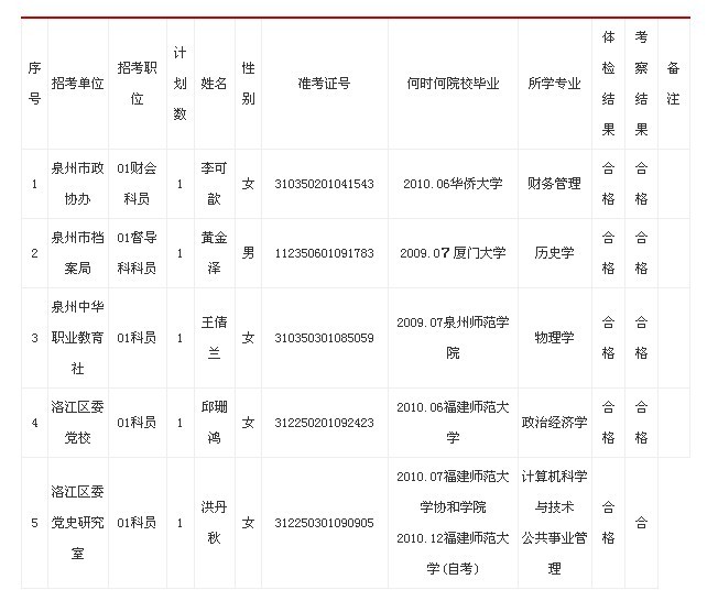 2012泉州市黨群系統(tǒng)秋考公務(wù)員擬錄用人員公示