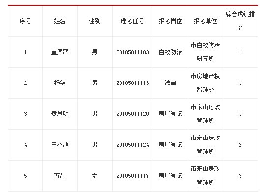 根據《2012年(下半年)宜昌市直事業單位公開招聘工作人員公告》,經筆試、面試、體檢及考核等程序,擬聘用下列人員為宜昌市房產管理局事業單位工作人員,現予以公示: