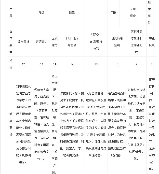 摘要 在每一個測評的維度上預(yù)先編制好面試題目并制定相應(yīng)的評分標(biāo)準(zhǔn),面試過程遵照一種客觀的評價程序,對被試者的表現(xiàn)進(jìn)行數(shù)量化的分析,給出一種客觀的評價標(biāo)準(zhǔn)