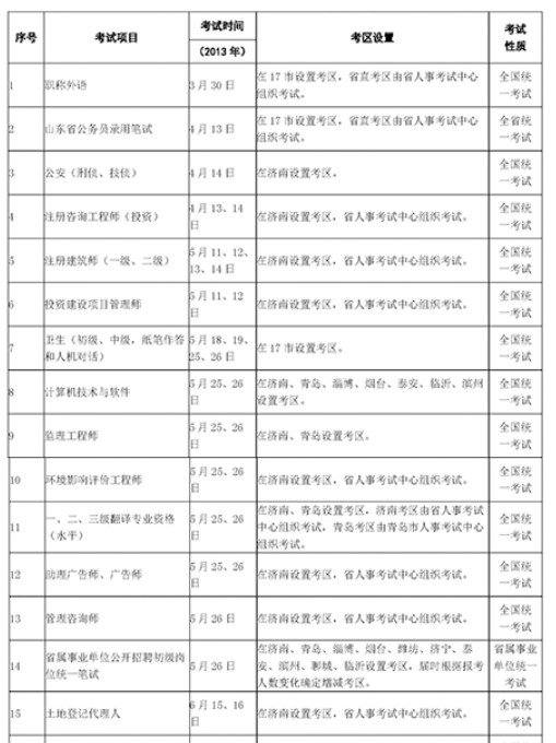 從山東省人力資源與社會保障局了解到,根據2013年度山東省人事考試計劃的安排,2013年山東省屬事業單位公開招聘初級崗位統一筆試時間定于2013年5月26日,會在濟南、青島、淄博、煙臺、濰坊、濟寧、泰安、濱州、聊城、臨沂設置考區,屆時根據報考人數變化確定增減考區。考試形式為省屬事業單位統一考試。