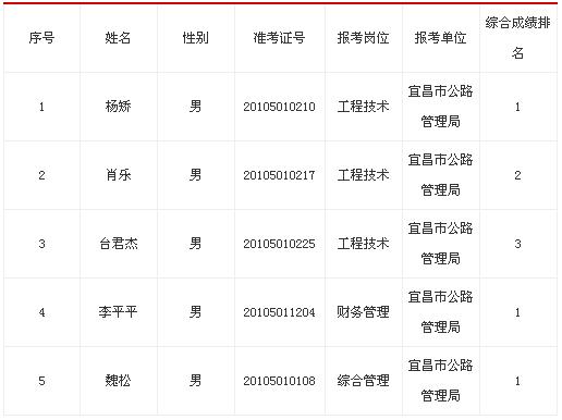 根據《2012年(下半年)宜昌市直事業單位公開招聘工作人員公告》,經筆試、面試、體檢及考核等程序,擬聘用下列人員為宜昌市公路管理局工作人員,現予以公示: