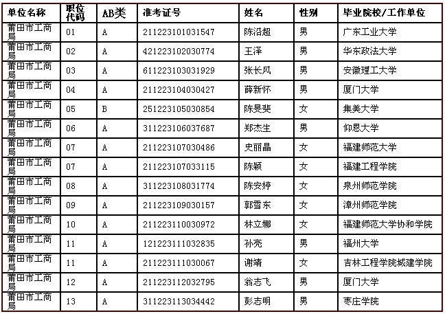 根據《公務員錄用規定(試行)》和《福建省2012年度秋季考試錄用公務員工作實施方案》的要求,在筆試、面試、體檢和考察合格的基礎上,擬錄用考生陳沿超等15人為福建省工商系統公務員。現向社會予以公示。公示期間,如有問題,請及時向福建省公務員局考試錄用處反映。
