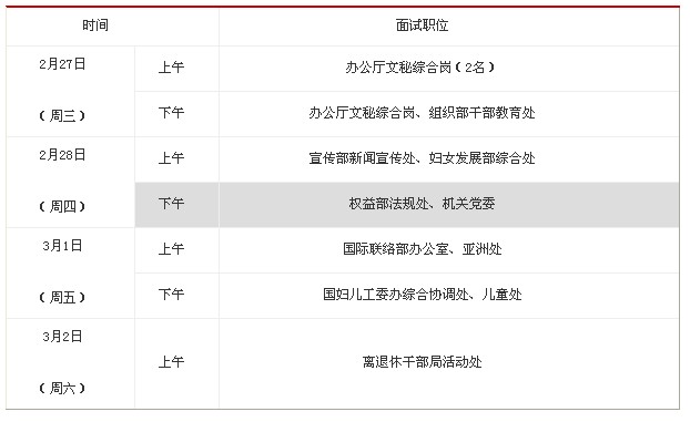 2月27日至3月2日,每天上午9:00、下午13:30準時開始。各職位具體時間如下: