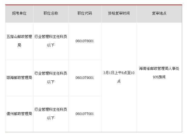 參加面試的考生請于2月5日前將身份證復印件、準考證復印件、學歷、學位證書復印件(應屆畢業生提供所在學校開具的報名推薦表復印件)、工作經歷證明復印件及其他與報考條件相關的證明材料復印件通過傳真或電子郵件的形式發送至海南省郵政管理局,進行資格預審。傳真或發送電子郵件確有困難的,可以通過郵政EMS寄送(以郵戳為準),請于2月5日前寄達(郵寄地址:海南省海口市南寶路22號海南省郵政管理局人事處收,郵編:570206)。