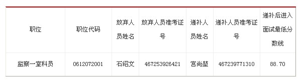 因部分進(jìn)入面試名單人員自愿放棄面試資格,根據(jù)公務(wù)員考錄有關(guān)規(guī)定,擬進(jìn)行遞補(bǔ),現(xiàn)將考錄面試遞補(bǔ)人員名單公告如下: