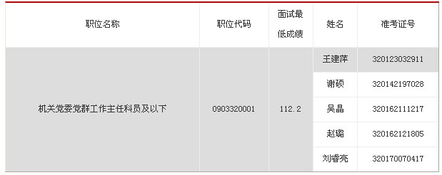 首批進入面試的人員中,因個人原因,進入面試名單考生袁曉宏、王浩然、進入面試遞補名單王永剛3名考生自愿放棄面試資格,根據招錄規定,按照筆試綜合成績高低,依次遞王建萍、謝碩進入面試,現面試名單如下:
