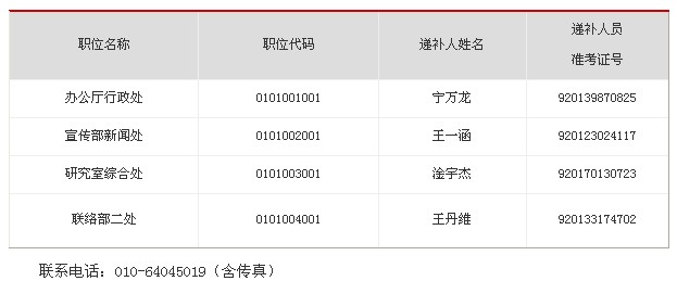 由于有部分進入我單位面試范圍的考生因個人原因自愿放棄面試資格,按照公務員招錄有關規定,經國家公務員局審核,從公共科目筆試合格考生中依筆試分數由高到底順序遞補以下面試人選(名單附后)。請遞補考生按照《臺盟中央2013年度公務員招錄面試公告》的有關要求,于2013年2月22日16:00前進行面試確認。