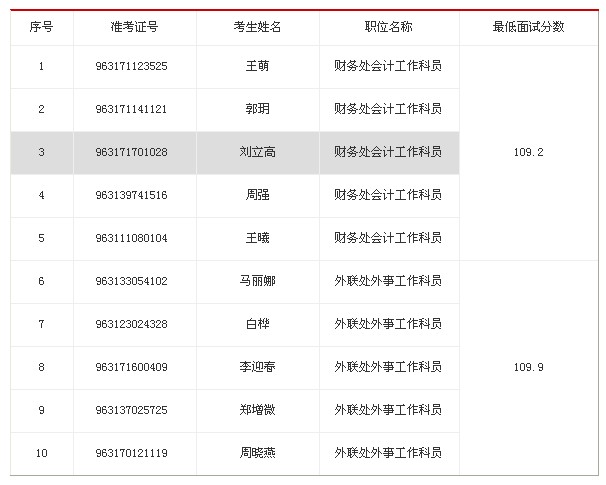 在公共科目筆試成績合格的考生中,按照每個職位筆試總成績從高到低的順序,共確定了10名面試對象。面試人員名單如下: