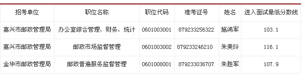 由于部分考生個人自愿放棄面試資格,根據中央機關及其直屬機構考試錄用公務員的有關規定,按公共科目筆試成績由高到低的順序,確定以下3人遞補參加浙江省郵政管理局2013年度公務員招考面試。