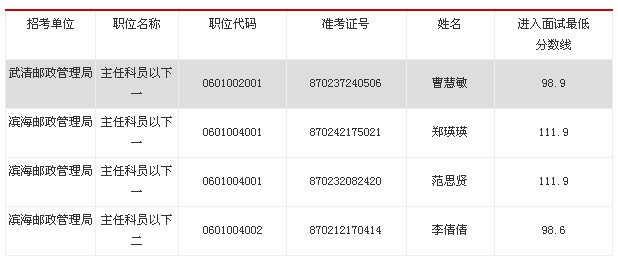 由于部分考生個人自愿放棄面試資格,根據中央機關及其直屬機構考試錄用公務員的有關規定,按公共科目筆試成績由高到低的順序,確定以下4人遞補參加2013年度天津市省以下郵政監管機構公務員招錄面試。