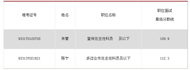 因部分進入面試范圍的考生自愿放棄面試資格,根據中央組織部、人力資源和社會保障部、國家公務員局關于公務員考試錄用工作的有關規定,按照公共科目筆試成績從高到低的順序,遞補以下2名考生進入面試名單,并調整相應職位的入圍面試分數線,詳見下表。