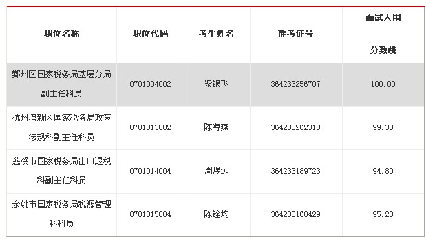 2013年公務員面試遞補公告:寧波市國家稅務局