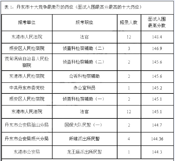 對丹東市2012年的面試入圍分數情況進行分析統計,總結出丹東市十大競爭最激烈崗位,最高分都沒有超過150分,相對其他地市分數較低。