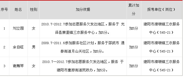 2013年建陽市事業單位招聘筆試成績加分情況公示