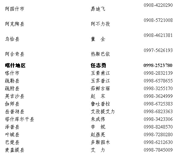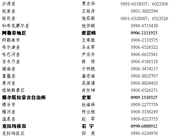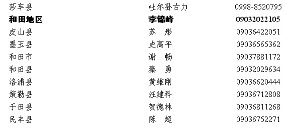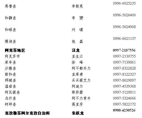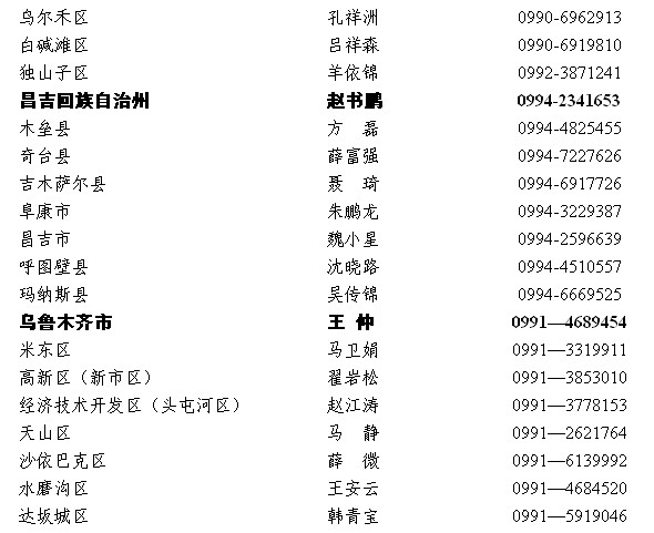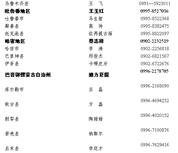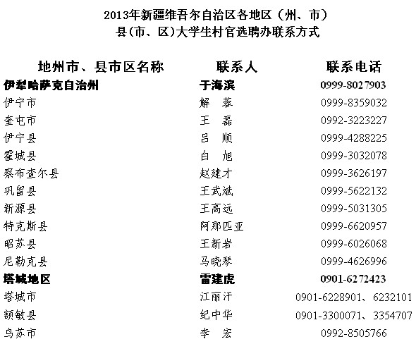 2013年新疆維吾爾自治區各地區大學生村官選聘辦聯系方式