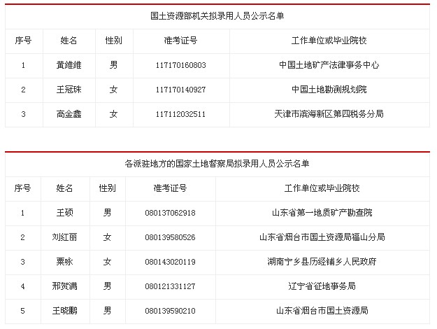 2013年國(guó)土資源部擬錄用公務(wù)員公示