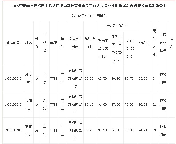 2013年5月11日上杭縣廣電局部分事業單位工作人員專業技能測試工作已經結束,現將測試總成績及體檢對象公布如下: