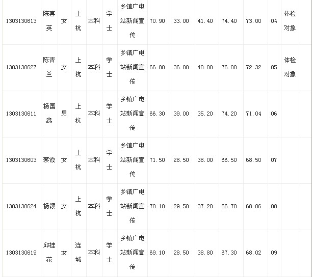 福建上杭縣2013年廣電局事業單位招聘成績及體檢對象公布