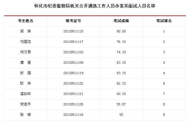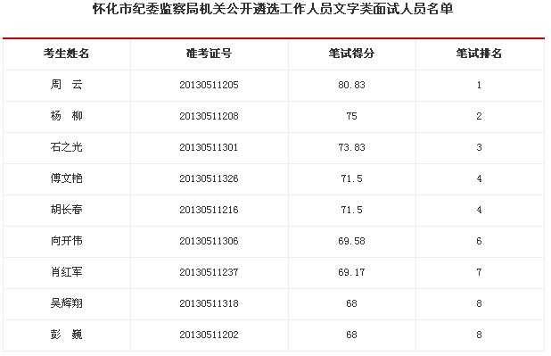2013年5月19日懷化市紀(jì)委監(jiān)察局機(jī)關(guān)公開(kāi)遴選工作人員進(jìn)行面試,現(xiàn)將面試人員名單及有關(guān)事項(xiàng)公告如下: