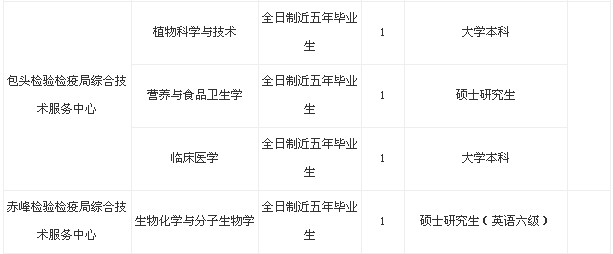 中華人民共和國內蒙古出入境檢驗檢疫局為國家質量監督檢驗檢疫總局設在內蒙古的直屬機構,下設14個分支局、2個辦事處。設有12個事業單位,分布在內蒙古局機關、滿洲里、二連浩特、包頭和赤峰檢驗檢疫局。事業單位主要承擔實驗室檢驗檢疫技術工作、研究咨詢及檢疫風險分析、傳染病監測體檢、國際旅行預防接種、技術開發服務、機關后勤服務等職能。根據事業發展需要,2013年擬招聘事業單位工作人員11名。招錄計劃如下: