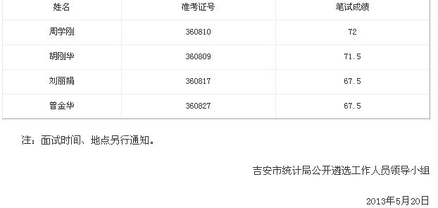 2013年5月18日,吉安市統計局普查中心公開遴選工作人員進行了筆試,從高分到低分前3名入闈參加面試人員名單如下: