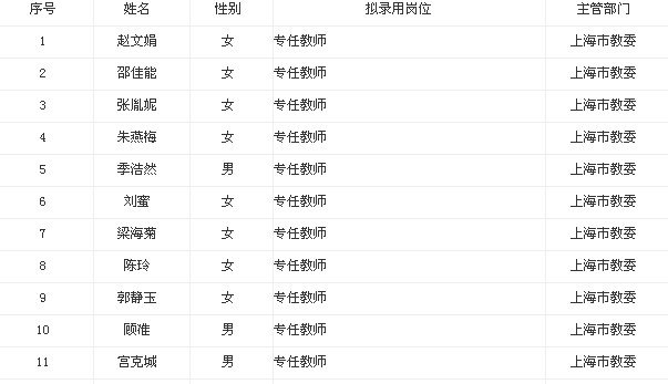 我單位根據《上海市事業單位公開招聘人員暫行辦法》【滬人社專發(2009)45號】的要求,擬錄用如下教師,現將有關情況予以公示。公示期間,如有異議,請向我單位反映。