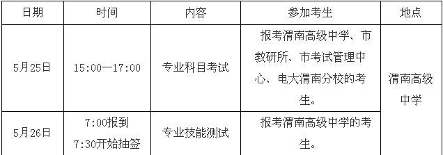 請參加專業技能測試的考生5月26日早7:00前到渭南高級中學明德樓4樓候考室報到,遲到30分鐘考生取消技能測試資格。