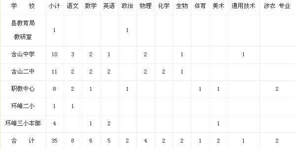 含山縣教育局教研室(教研員)選調范圍為本縣完(職)中和初中在編在職教師;含山中學、含山二中和縣職教中心文化課教師選調范圍為本縣農村完(職)中和初中在編在職教師;縣職教中心涉農專業課教師選調范圍為縣高級職業中學在編在職教師;環峰第二小學、環峰第三小學選調范圍為本縣農村小學在編在職教師。