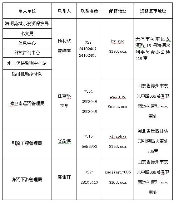 考生填寫《水利部海委所屬事業單位公開招聘工作人員報名登記表》(附件2),通過電子郵件發送到用人單位。各用人單位對考生資格進行審查,并通過電子郵件回復資格審查意見。同一崗位資格審查合格人數少于崗位招聘人數的3倍,原則上取消該崗位的招聘,用人單位電話告知考生。