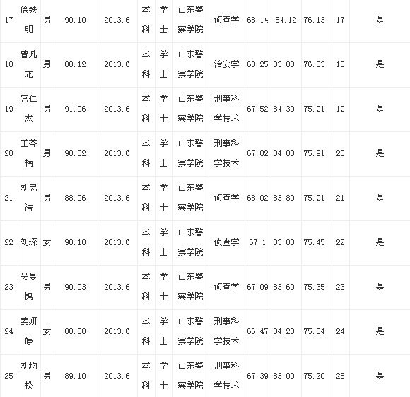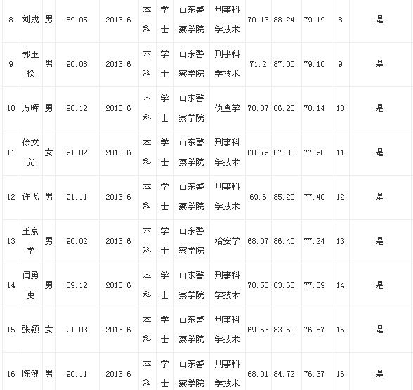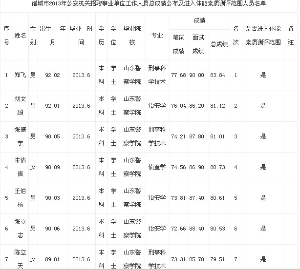 2013年諸城市公安機關招聘總成績及體能測評名單