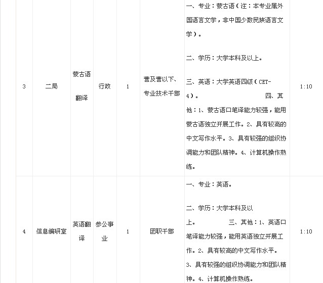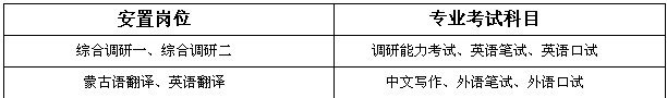 綜合調研一、綜合調研二崗位重點考察考生的調研理論基本功、文字表達能力和英語水平;蒙古語翻譯、英語翻譯崗位重點考察本專業外語的聽、說、讀、寫、譯等基本功。