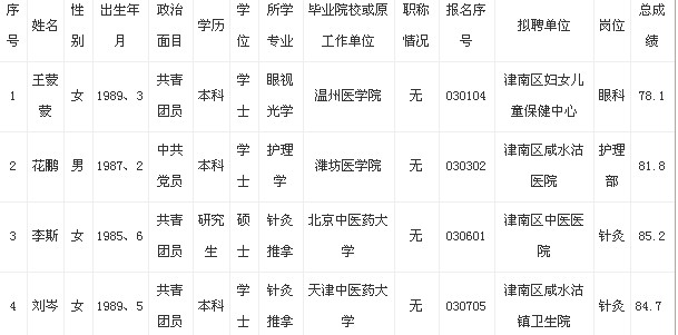 2013年天津津南區事業單位擬聘用人員公示
