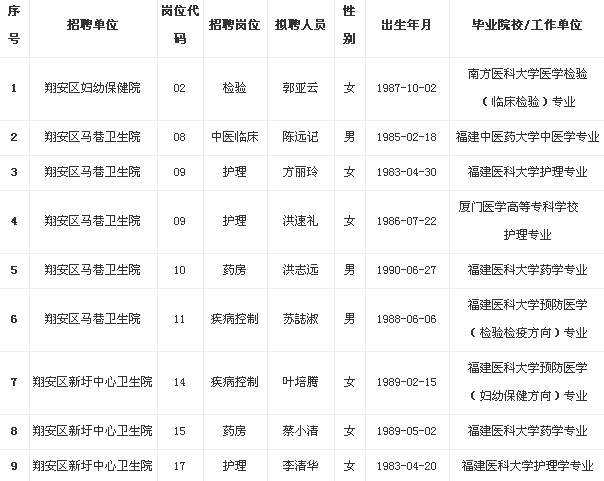 根據《廈門市事業單位補充工作人員暫行規定》的文件精神,廈門市翔安區衛生系統事業單位2013年補充編內工作人員考試的公開招聘,通過筆試、面試、體檢、考核等程序,現將翔安區婦幼保健院等單位擬聘用人員公示如下: