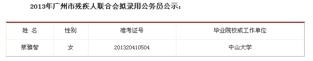 摘要 2013年廣東廣州市殘聯擬錄用公務員公示