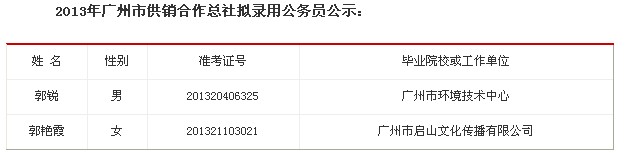 2013年廣東廣州市供銷合作總社擬錄用公務員公示