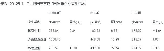 D. 2012年l一7月,國有企業與東盟10國的進出口額占比較上年同期上升1.1個百分點