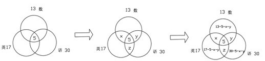 【例題】某班有35個學(xué)生,每個學(xué)生至少參加英語小組、語文小組、數(shù)學(xué)小組中的-個課外活動小組。現(xiàn)已知參加英語小組的有17人。參加語文小組的有30人,參加數(shù)學(xué)小組的有13人。如果有5個學(xué)生三個小組全參加了,問有多少個學(xué)生只參加了一個小組?