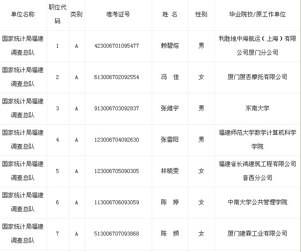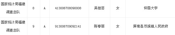 根據《公務員錄用規定(試行)》和《福建省2013年度考試錄用公務員工作實施方案》的要求,在筆試、面試、體檢和考察合格的基礎上,擬錄用考生賴碧熔、馮佳、張維宇、張雷陽、林曉雯、陳婷、陳頻、吳桂蕓、陳春麗等9人為國家統計局福建調查總隊工作人員。現向社會予以公示。公示期間,如有問題,請及時反映。