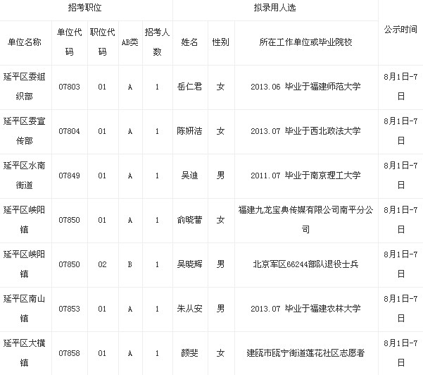 現根據《2013年福建省考試錄用公務員公告》及南平市招考簡章要求,陸續對考試、體檢、考察合格擬錄用國家公務員和參照公務員法管理機關(單位)工作人員名單進行公示(具體公示期見表格),在此期間歡迎廣大群眾以來信來電來訪的形式實事求是反映情況,接待(來信投遞)科室:南平市委組織部干部三科,聯系電話:8823008。