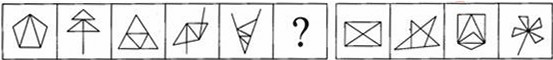 例3 【2012-國家-89】把下面的六個圖形分為兩類,使每一類圖形都有各自的共同特征或規律,分類正確的一項是( )