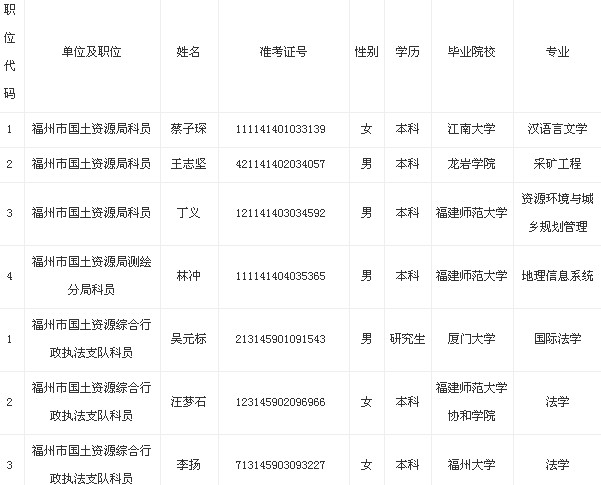 2013年福建福州市國土資源局擬錄用公務員名單公示