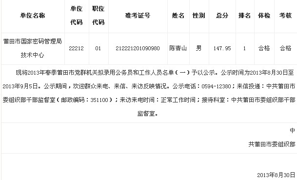 2013年福建莆田市黨群機關擬錄用公務員名單公示(一)