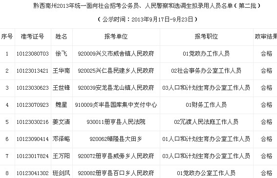 2013年貴州黔西南公務(wù)員(警察)及選調(diào)生擬錄名單(第二批)