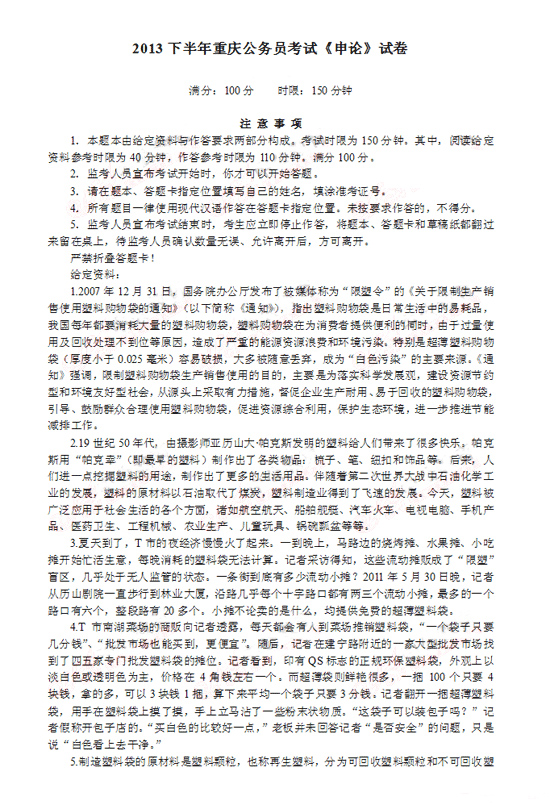 2013年重慶市公務員考試申論真題