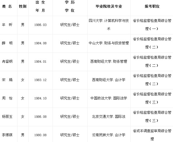 根據中共四川省委組織部、四川省人力資源和社會保障廳、四川省公務員局《關于2013年上半年省直機關和垂管系統公開考試錄用公務員的公告》規定,報考省價格監督檢查局、省成本調查監審局考生牟昕等7名同志經筆試、面試、體檢、考察合格,擬進入錄用程序,F將擬錄用人員情況公示如下: