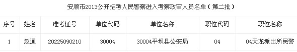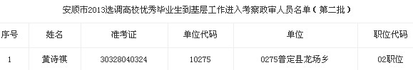 根據《貴州省2013年省、市、縣、鄉四級機關統一面向社會公開招考公務員和選調高校畢業生到基層工作簡章》、《貴州省2013年法院、檢察院、公安(森林公安)、司法機關統一面向社會公開招考人民警察簡章》、《貴州省2013年選調高校優秀畢業生到基層工作簡章》規定,經市公務員招考辦研究,現將第二批政審考察人員名單予以公示。