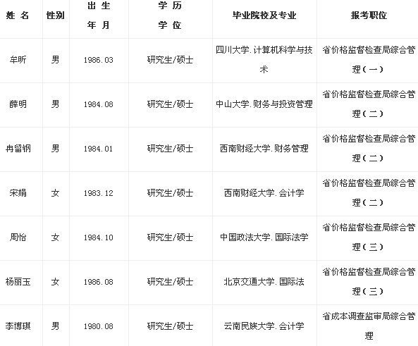 根據中共四川省委組織部、四川省人力資源和社會保障廳、四川省公務員局《關于2013年上半年省直機關和垂管系統公開考試錄用公務員的公告》規定,報考省價格監督檢查局、省成本調查監審局考生牟昕等7名同志經筆試、面試、體檢、考察合格,擬進入錄用程序。現將擬錄用人員情況公示如下: