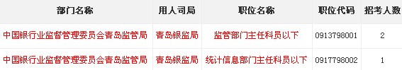 2014年國家公務員考試銀監會青島監管局職位表如下: