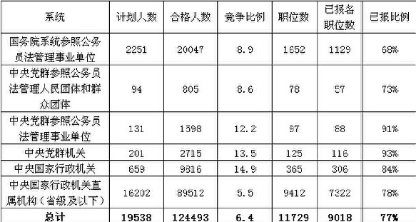 截止到10月18日8時(shí),國(guó)考總體審核通過(guò)人數(shù)為124493人,較去年同期的122430人,上升了2063人。平均競(jìng)爭(zhēng)比例達(dá)6.4:1, 較去年同期的 5.86:1有所增大。