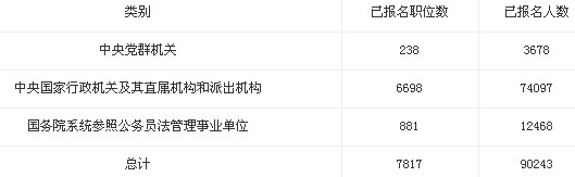 截止到10月17日17時,國考報名已有7817個職位(占總職位數(shù)的67%),共90243名考生完成報名并通過資格審查。具體情況如下: